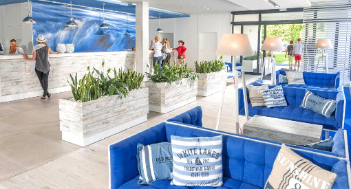 Lift, Speiseraum, Café mit Bar, Aufenthaltsraum, 2 Schwimmbäder (8 x 12 m und 5 x 12 m inkl. Kinderbecken und Hydromassage), 2 Whirlpools, Sauna, Friseur, Kosmetiksalon und eine moderne Kurabteilung. Im weitläufigen Außenbereich mit viel Grün gibt es Sitzgruppen, Spielplätze, eine Liegewiese, einen Grill- und Lagerfeuerplatz und einen abgeschlossenen, elektronisch gesicherten Parkplatz (gebührenpflichtig).