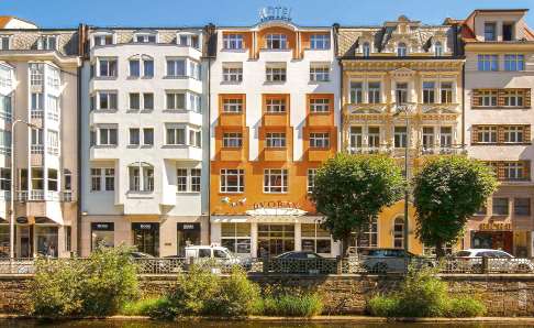 liegt am Fluss Tepla in exklusiver Lage unweit des Kurpavillons und der Trinkkolonnaden von Karlsbad, nur ca. 150 m von der Heilquelle №1 „Wrzydlo“ entfernt.