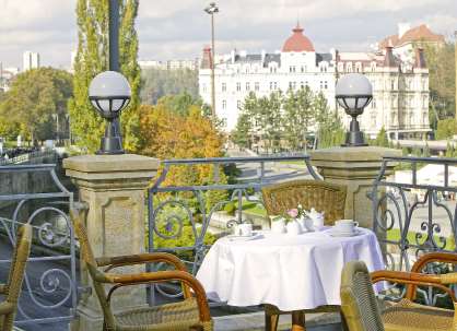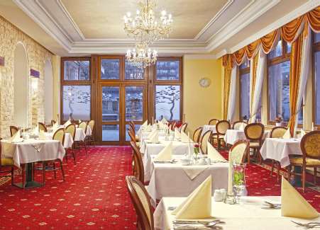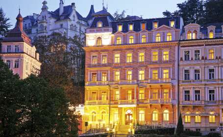 Es genießt eine ruhige Lage im Zentrum von Karlsbad, in der Nähe der Quellen und verfügt über einen großen Wellnessbereich mit Pool.
