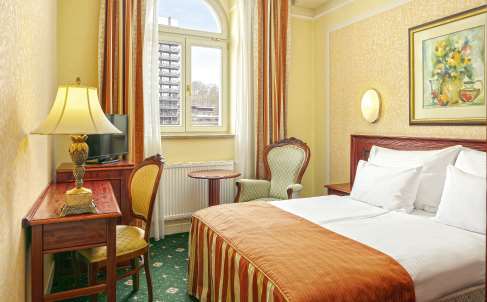 37 Zimmer mit Dusche oder Badewanne und WC, Föhn, Bademantel und Badeschuhe, Kosmetikspiegel, Schreibtisch, Minibar, Telefon, Sat-TV, Zimmersafe und schallisolierten Fenstern. Viele Zimmer haben einen Balkon mit Blick auf den Fluss Teplá und die malerische Altstadt.